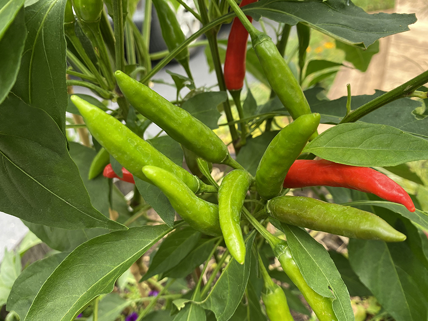 I am also growing Thai chili peppers this season. The peppers start off green and turn red. The red version is hotter than the young green peppers. At the end of the season, you can harvest all of the peppers and dry them out. They can then be ground up to make your own hot pepper flakes for sauces and pizza!