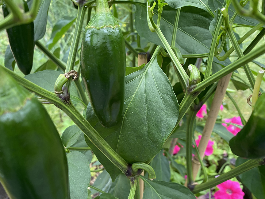 There are many varieties of peppers: some are sweet and some have varying degrees of heat. I try to mix it up and grow different varieties every year. This summer, my jalapeño plants are doing great. I’ve made jalapeño poppers several times from my harvest. The key to keeping the peppers from being overly spicy is to pick them when they are young and smooth. As they age, they get striations in their skin which indicates a high level of heat.