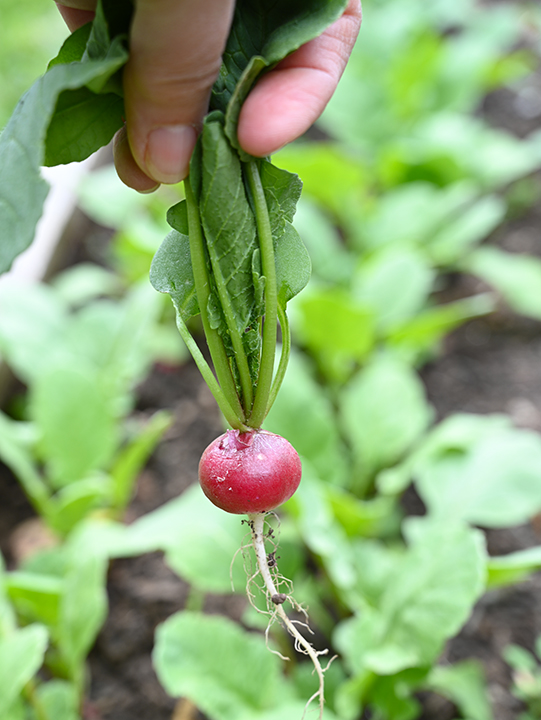 After only a month in the ground, the radishes will be ready to harvest! You can tell when they are ready to harvest when the beautiful red bulbs start showing above the ground like in the photo above. Newly ripe radishes are less bitter than older radishes, so don’t leave them too long in the ground once you see them. I sprinkle them with salt and eat them plucked straight out of the ground!