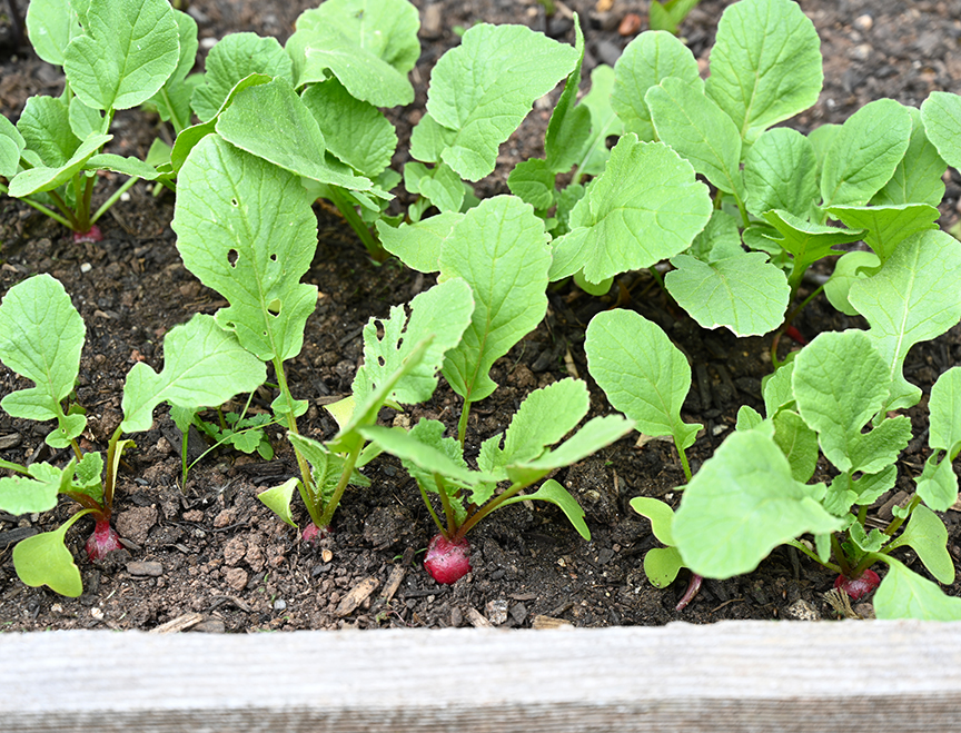 Radishes are one of the most rewarding and easy crops to grow. I plant my radish seed tape, a biodegradable material that holds the radish seeds in place, the second week in April. The plants thrive in cool morning weather and warm afternoon sun. The seed tape helps keep the plants evenly spaced apart so the radish bulbs have room to grow beneath the surface. They may still require thinning for each plant to be at least 2 inches apart.