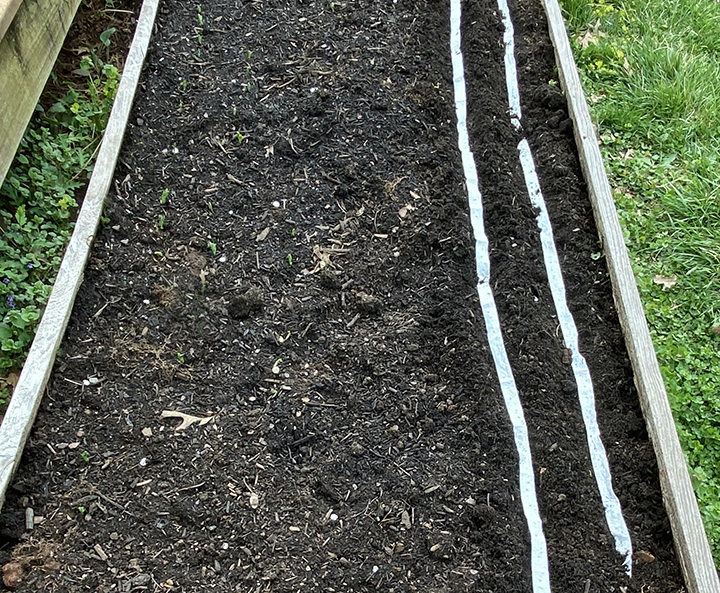 The radish seedlings emerge in just 7 days after planting (don’t forget to lightly water them daily). The tape helps keep them in fairly straight rows so there is less waste from having to thin clumps of growing plants.